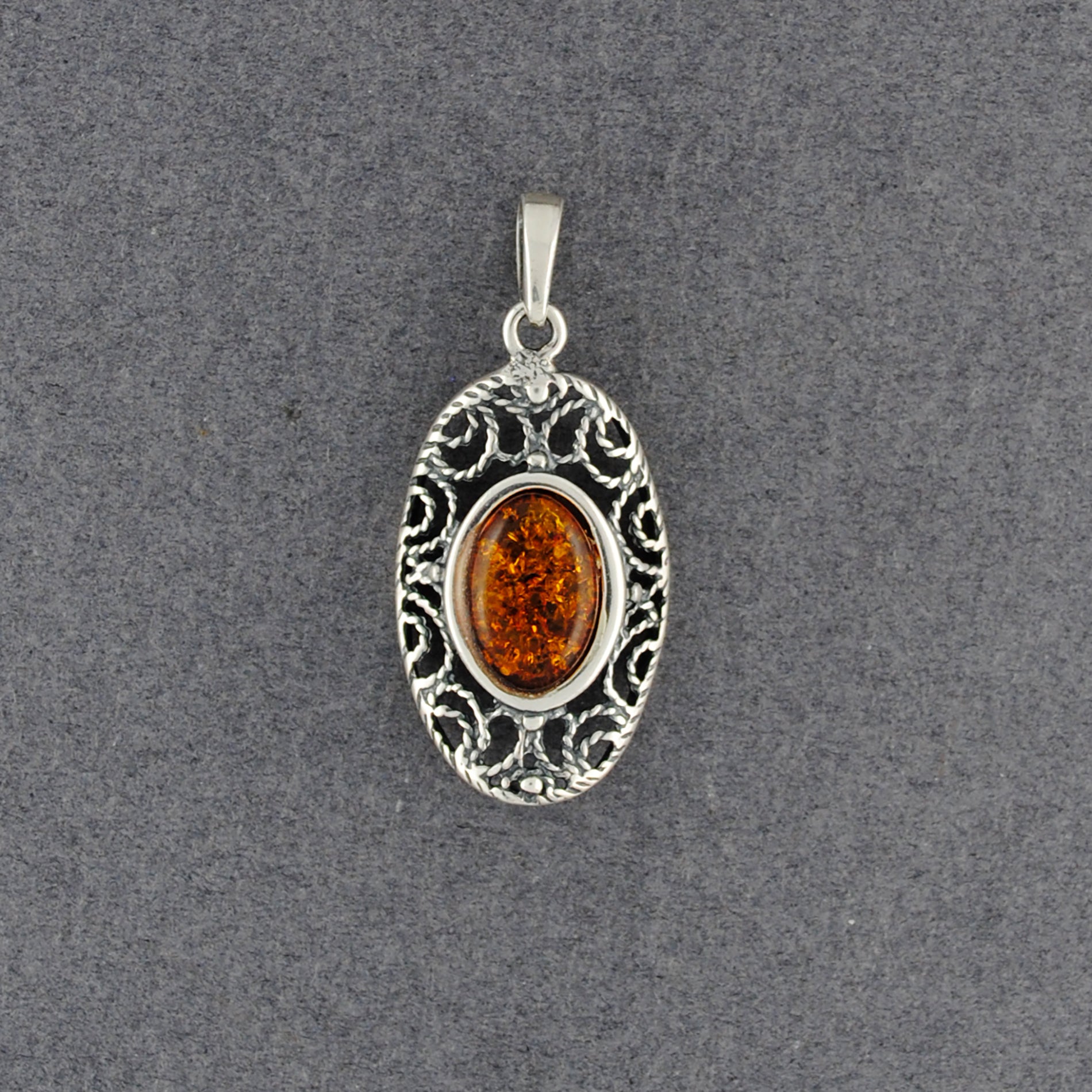 Amber is hardened tree resin from prehistoric forests 40 - 50 million years ago. Though its transparency and color varies, the most common colors are orange, yellow and brown. Amber can also range into milky whites and deep reds. Your piece was designed and set in sterling silver by Polish craftsmen. The amber carried at Green River Silver Co. comes from the Baltic region and is imported directly from Gdansk, Poland.
