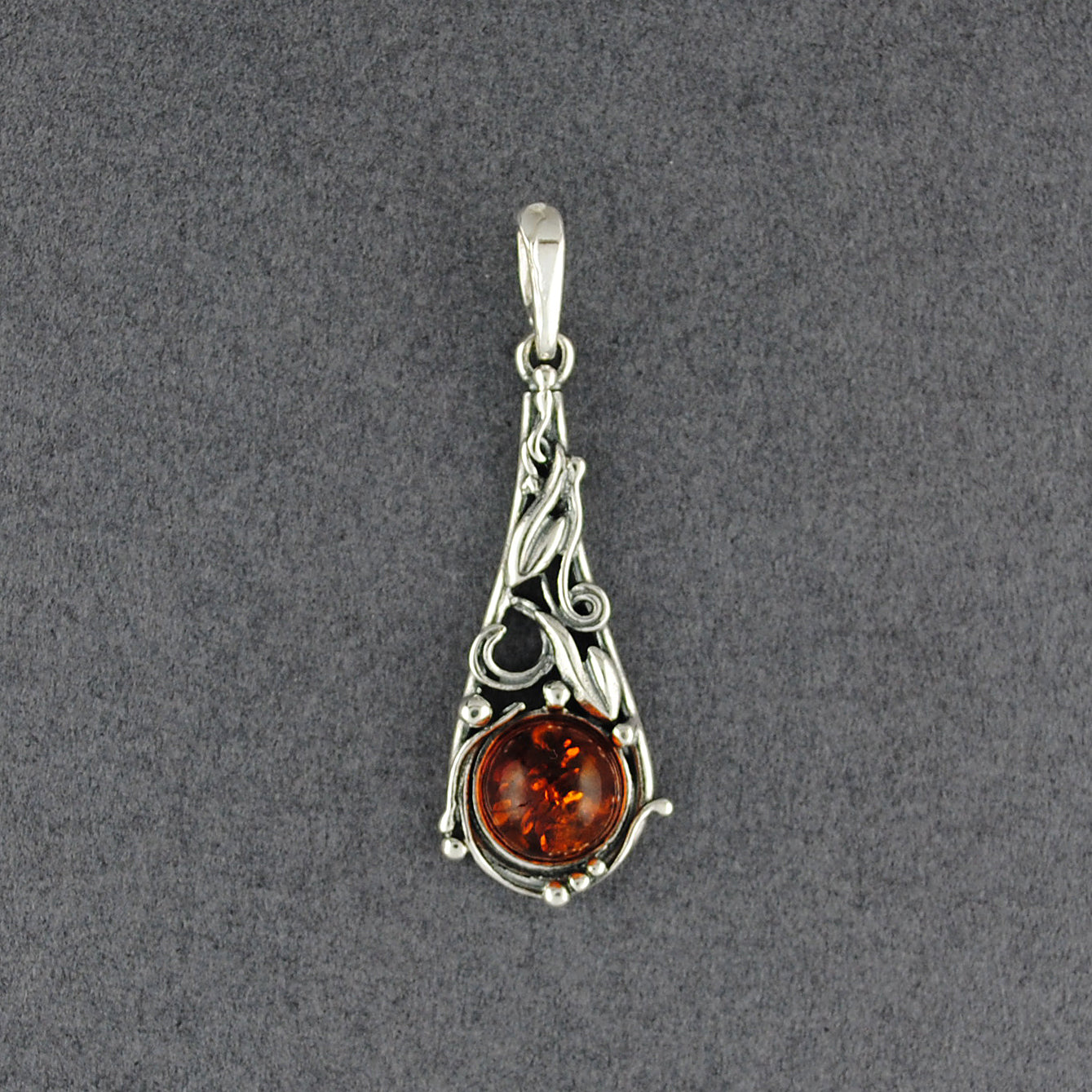Amber is hardened tree resin from prehistoric forests 40 - 50 million years ago. Though its transparency and color varies, the most common colors are orange, yellow and brown. Amber can also range into milky whites and deep reds. Your piece was designed and set in sterling silver by Polish craftsmen. The amber carried at Green River Silver Co. comes from the Baltic region and is imported directly from Gdansk, Poland.