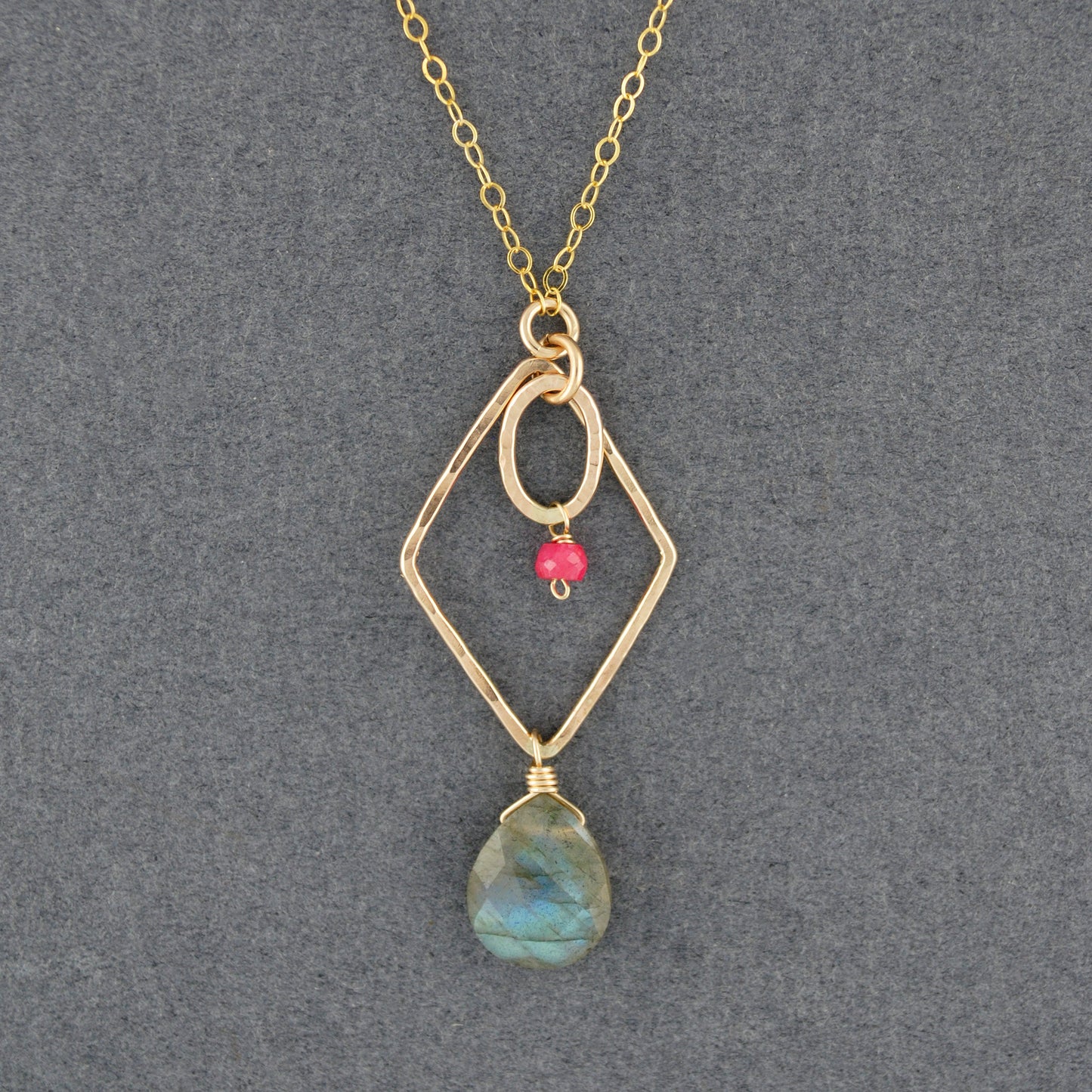 Handcrafted with precision and passion, this pendant features a shiny gold diamond shape, reminiscent of ancient talismans and timeless elegance. Suspended gracefully from its apex is a bewitching labradorite gemstone, its surface alive with iridescent hues that dance with the light, capturing the essence of ethereal dreams. A tiny ruby accent, like a drop of blood-red passion, graces the pendant, adding a touch of mystery and charm.