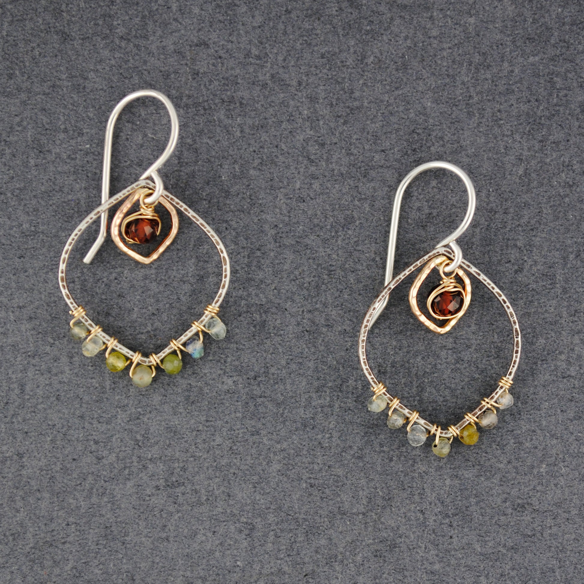 Handmade with love, these oxidized silver leaf shapes feature a delicate vine of tiny green sapphire gemstones, intricately wrapped around the design. Accented with a touch of gold and a radiant red garnet, these earrings bring a subtle yet striking pop of color, perfect for adding a touch of nature-inspired elegance to any outfit.
