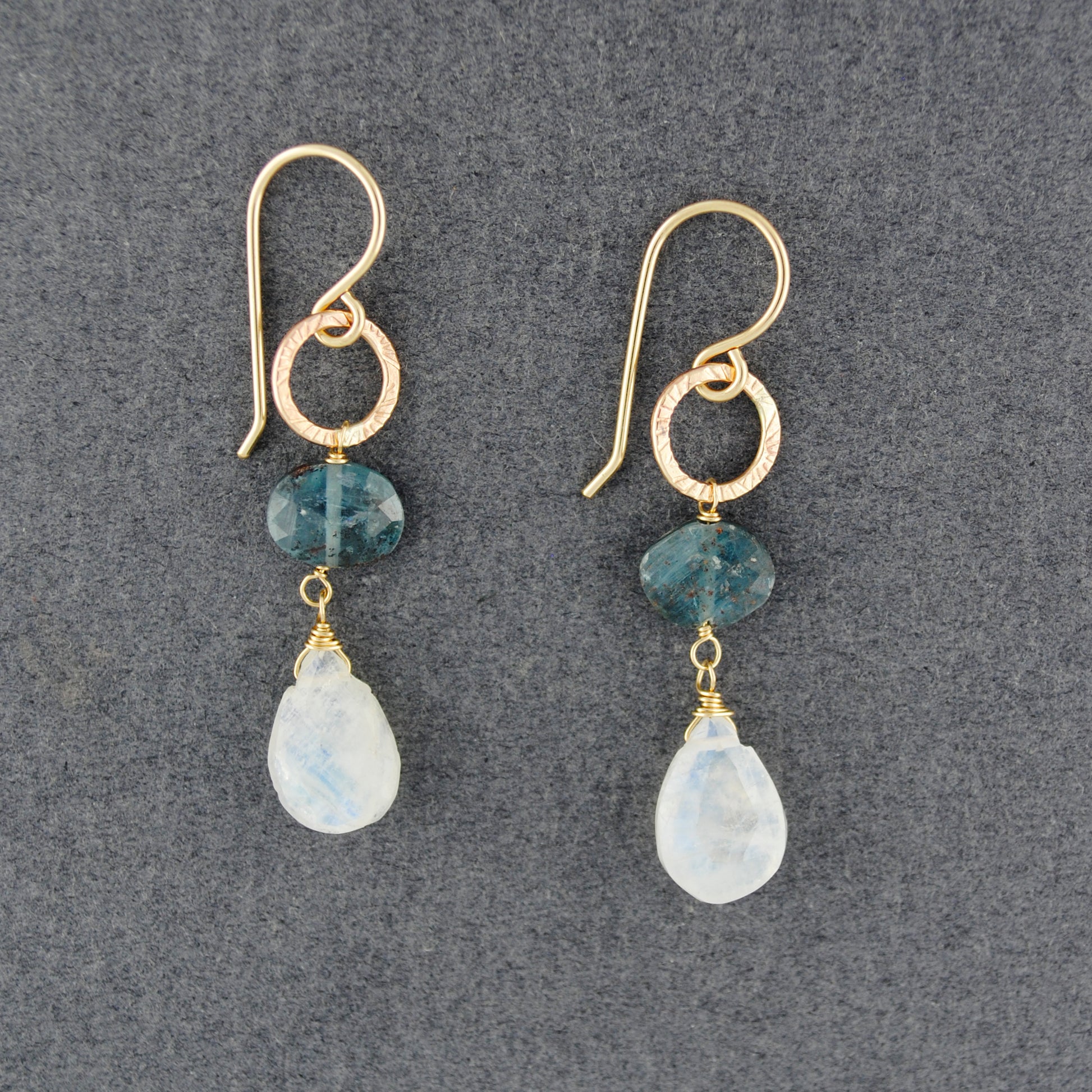 Indulge in the enchanting allure of our Gemstone Rebirth Earrings. The captivating dance of stunning moonstones takes center stage, delicately dangling from vibrant kyanite gemstones. Enhanced by handcrafted gold-filled accents, these earrings radiate timeless beauty and effortless elegance.