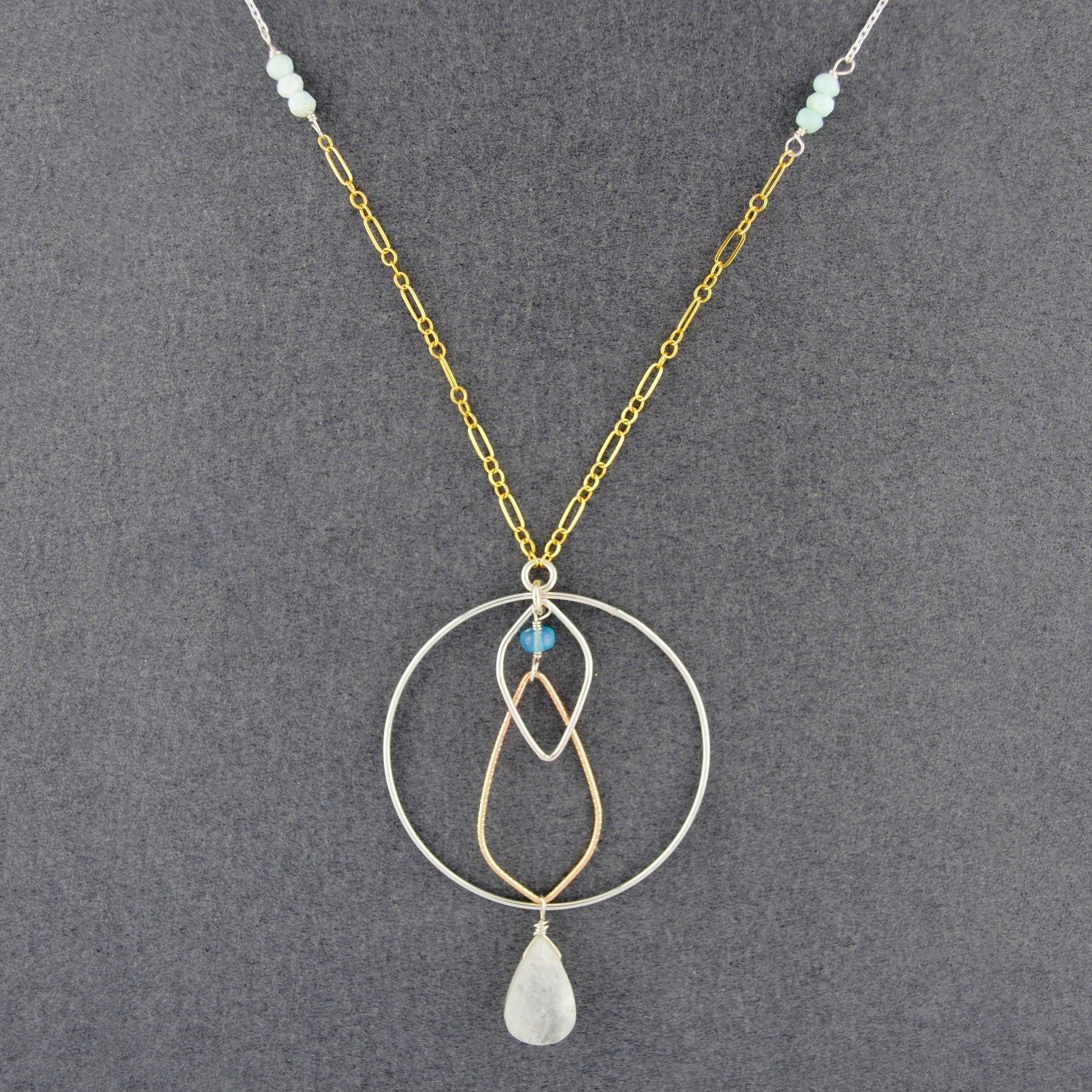 The Iridescent Droplet Moonstone Necklace is a luminous expression of light and form. This handcrafted piece features a layered pendant with intertwined sterling silver and 14k gold filled teardrop shapes, suspended within a silver circle. At its center, a glowing moonstone drop shimmers with soft iridescence, while a tiny blue opal accent adds a touch of unexpected color. Finished with a delicate mixed metal chain adorned with small aqua-toned gemstone details, this necklace brings an ethereal, modern elegance to everyday wear.