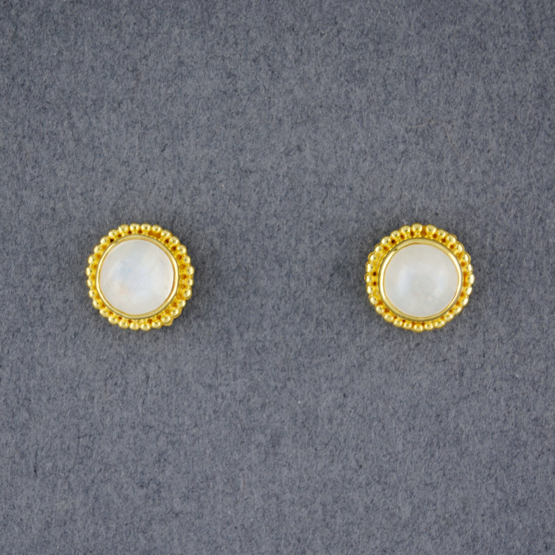 Rainbow Moonstone studs handcrafted in 18K Gold, thickly coated over .925 Sterling Silver. Featuring two 7mm Rainbow Moonstones to enhance your intuition, provide protection and attract love.