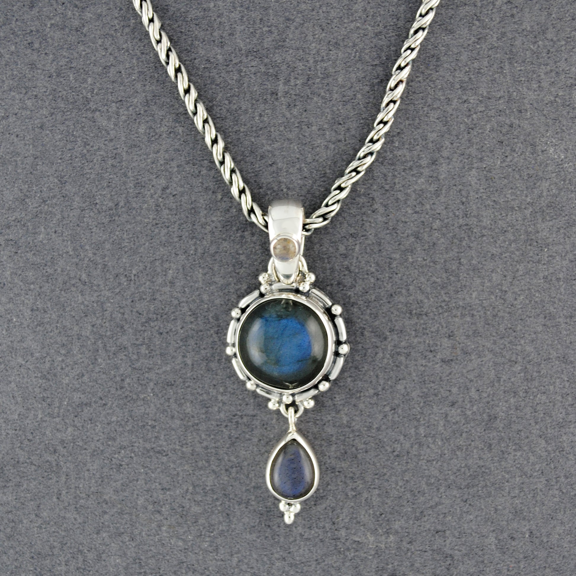 Labradorite Boho Pendant Necklace handcrafted in the finest .925 Sterling Silver. Featuring one 12mm, one 8x6mm and one 3mm Labradorite gemstones from India, to amplify psychic abilities, dispel negativity and bring emotional balance.. Handmade Triple Chain which adjusts 16" to 18" with hook clasp.