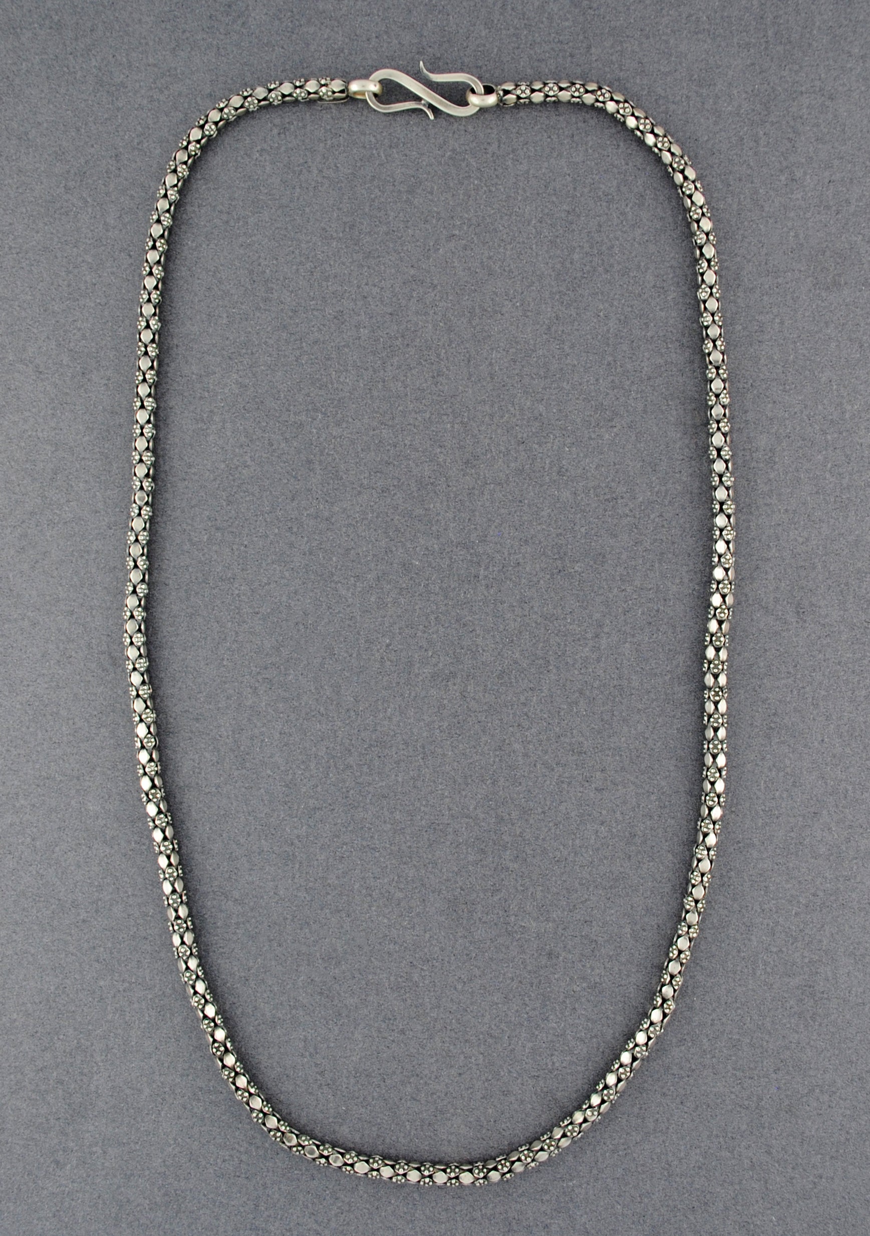 Designed in the 1980s by Ethan Stein in his workshop, Kohkan. These vintage necklaces were based on traditional Indian designs and hand crafted in sterling silver by local silversmiths until the workshop closed. Limited quantities of these exquisitely crafted necklaces are now available exclusively at Green River Silver Co. Enjoy this beautiful piece of wearable art from the heart of India.