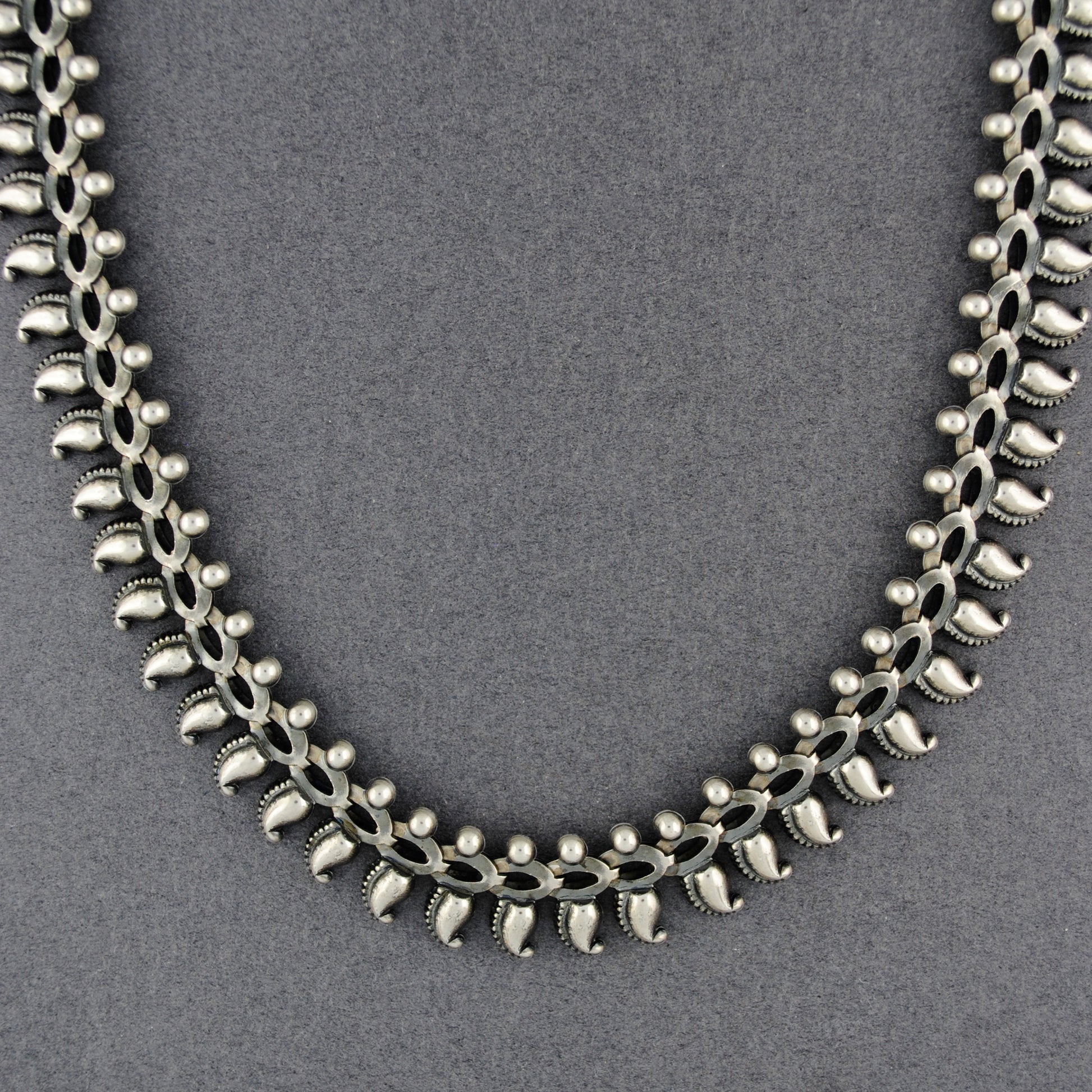 Designed in the 1980's by Ethan Stein in his workshop, Kohkan. These vintage necklaces were based on traditional Indian designs and hand crafted in sterling silver by local silversmiths until the workshop closed. Limited quantities of these exquisitely crafted necklaces are now available exclusively at Green River Silver Co. Enjoy this beautiful piece of wearable art from the heart of India.