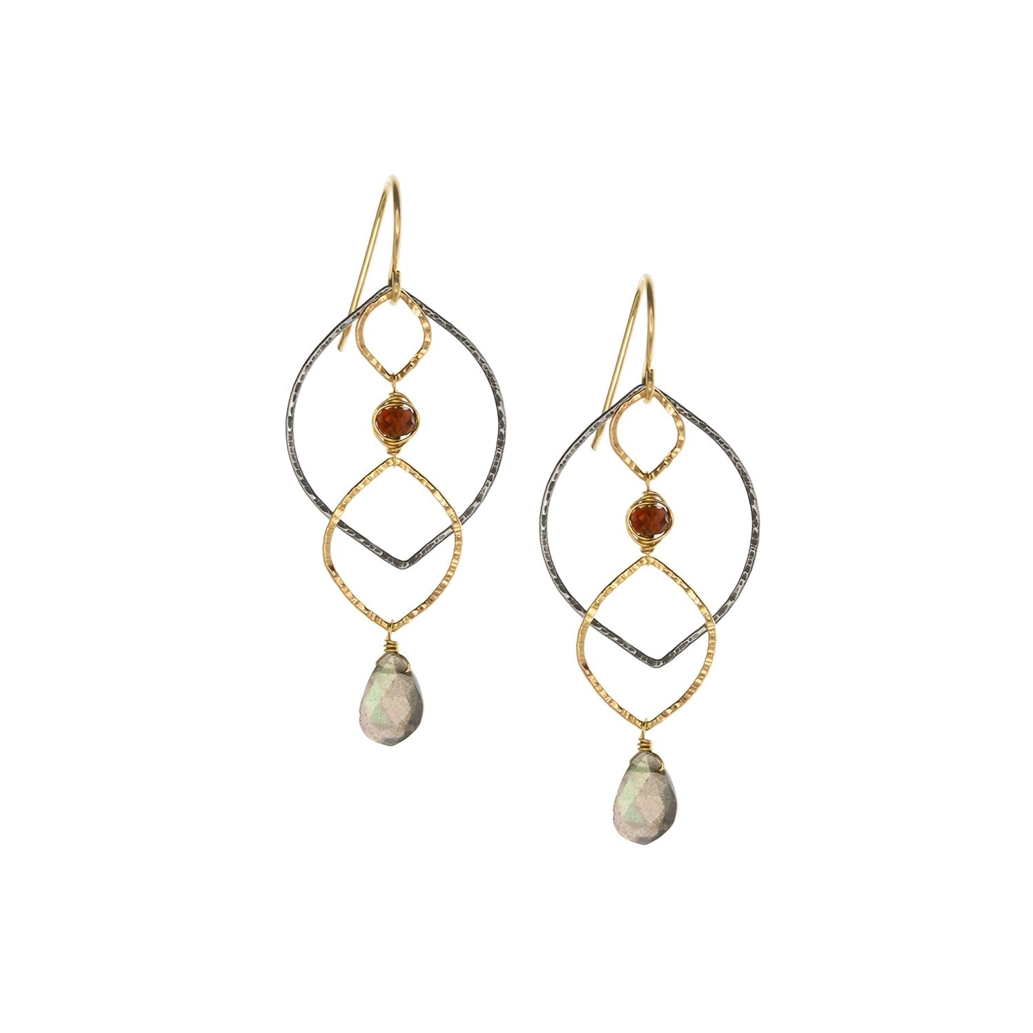 Make a statement with these lightweight beauties, featuring layers of sterling silver and gold-filled handmade leaf shapes that sway gracefully. Flashing labradorite gemstone drops add a mesmerizing touch, while intricately wire-wrapped garnet gemstones at the heart of the earrings bring a rich pop of color. Perfect for adding a bold yet elegant accent to any look.