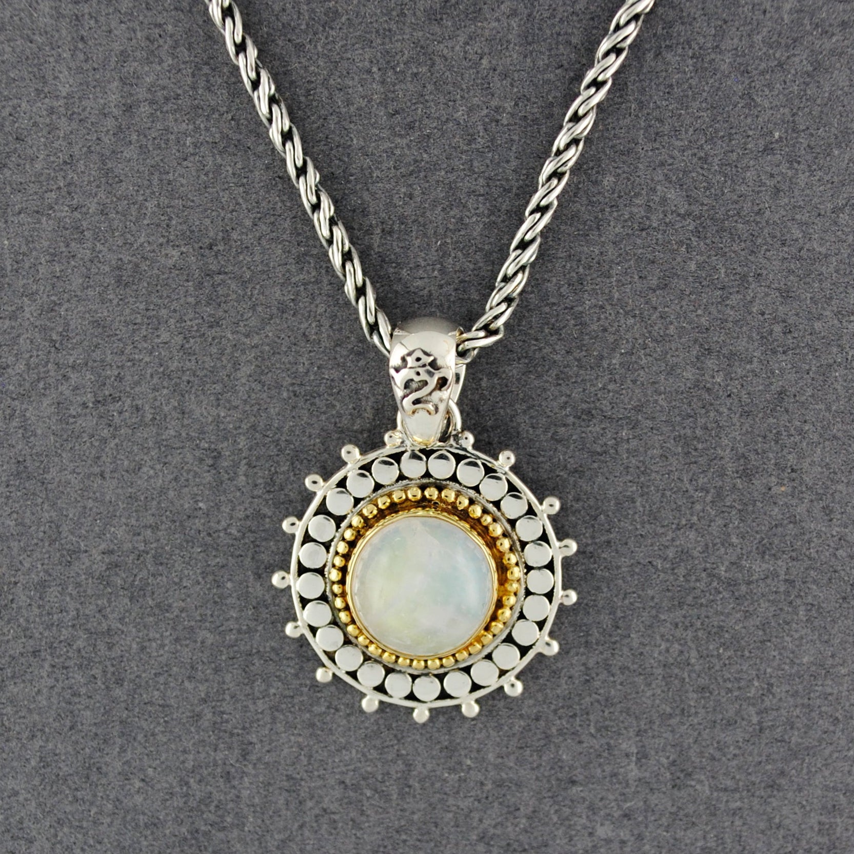 Rainbow Moonstone teardrop necklace handcrafted in the finest .925 Sterling Silver and 18K Gold Vermeil (18K Gold over Sterling Silver). Featuring one 11 mm Rainbow Moonstone from India, to enhance your intuition, provide protection and attract love. Handmade Triple Chain which adjusts 16" to 18" with hook clasp.
