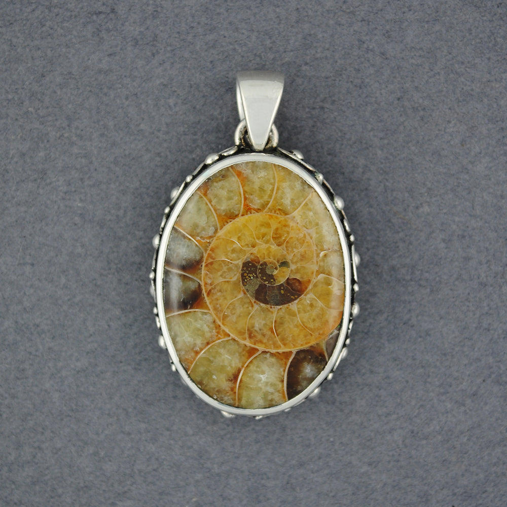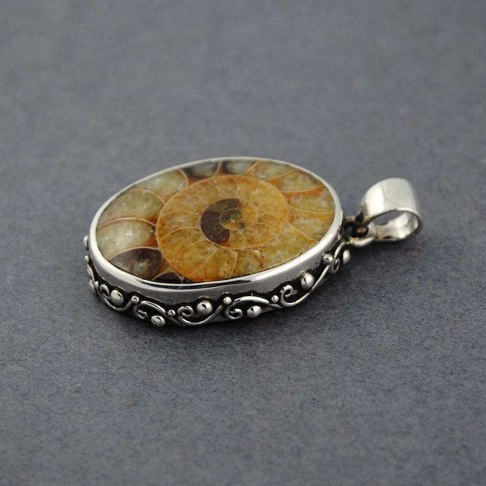Sterling Silver Ammonite Pendant with Ornate Bezel