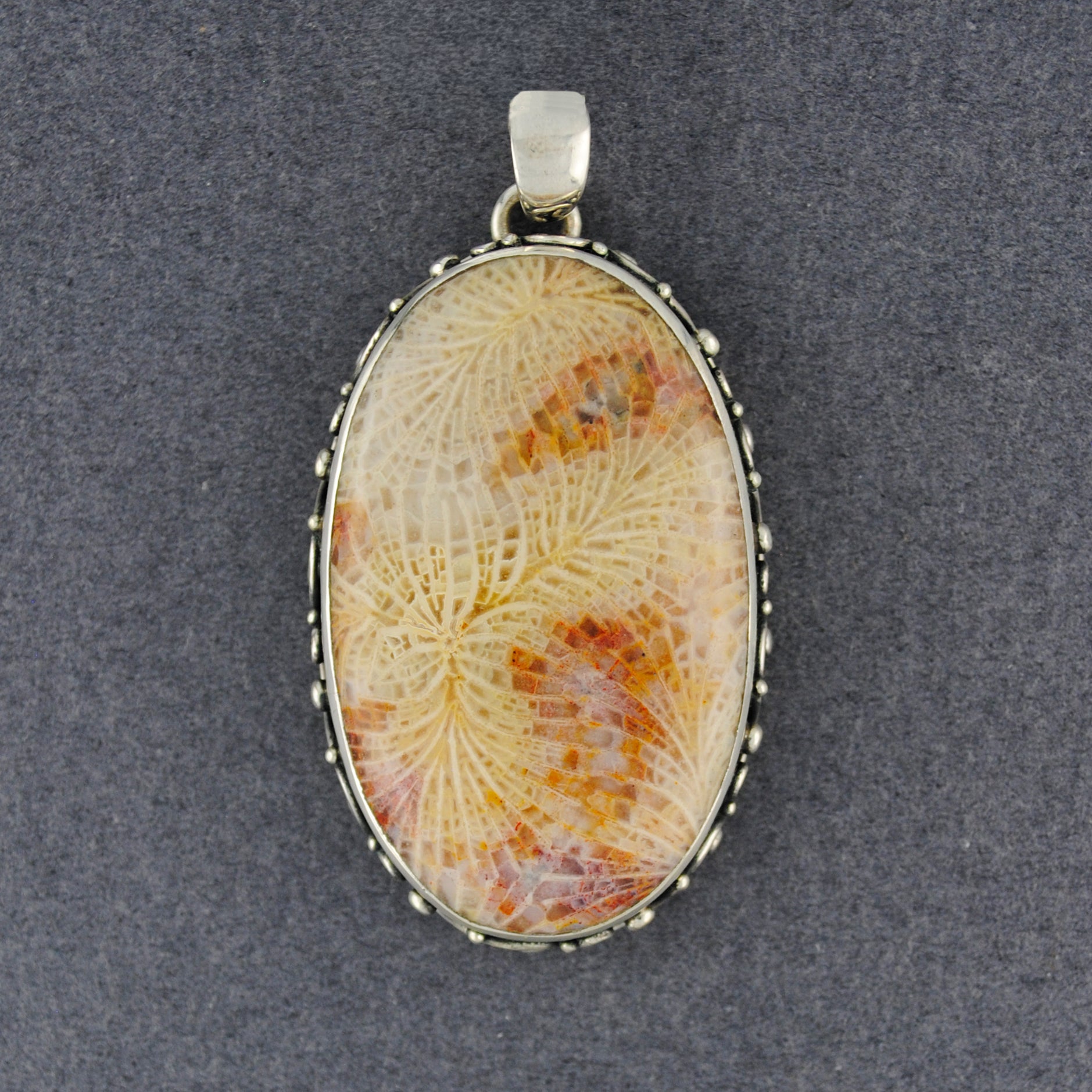 Sterling Silver Fossilized Coral Fancy Oval Pendant