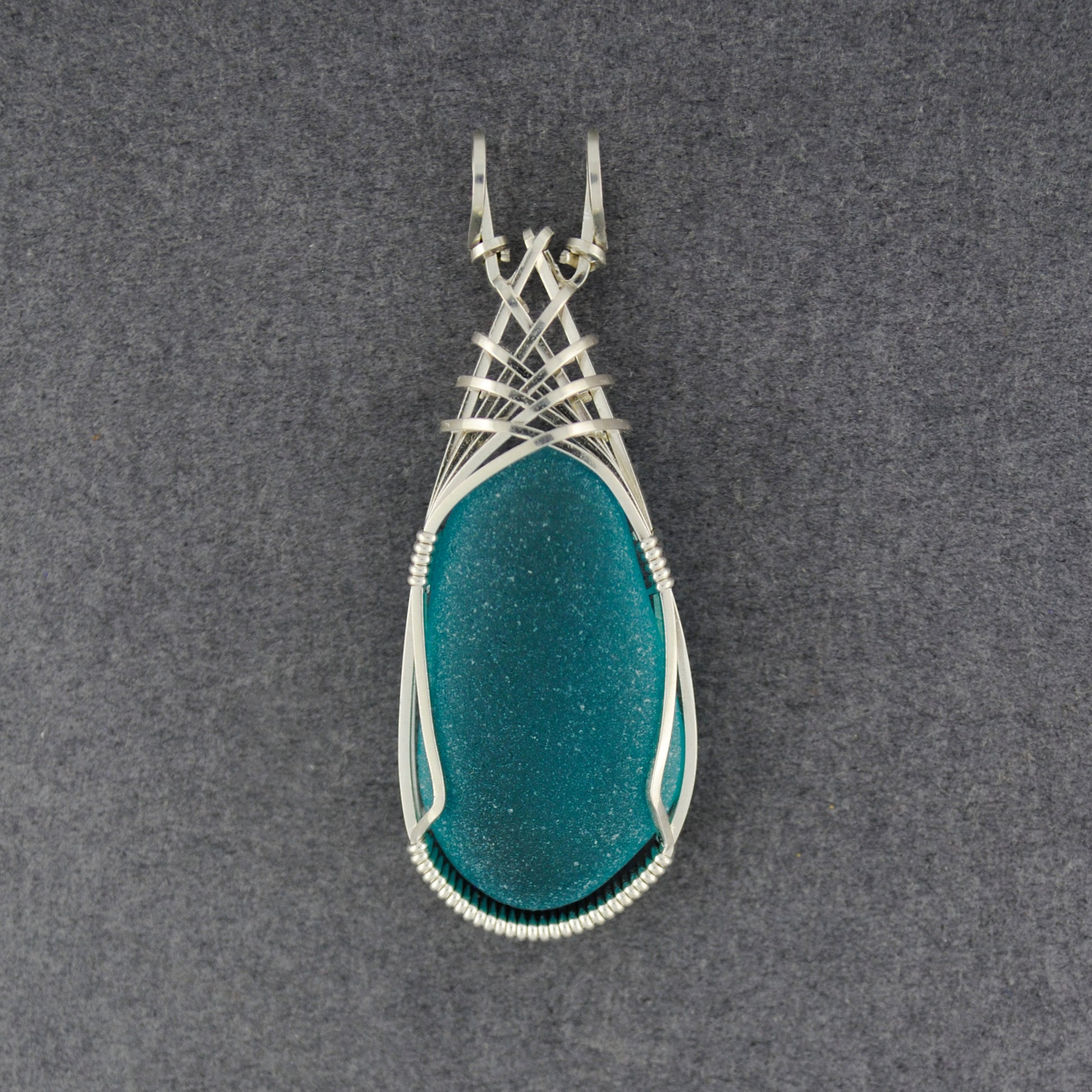 Sterling Silver Long Aqua Sea Glass Weave Pendant