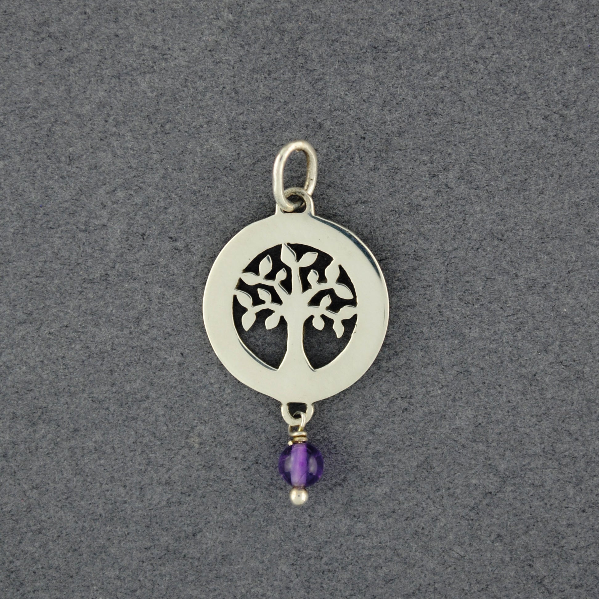 A hand made pendant featuring the Tree of Life in a round frame accented with a dangling semi-precious stone.