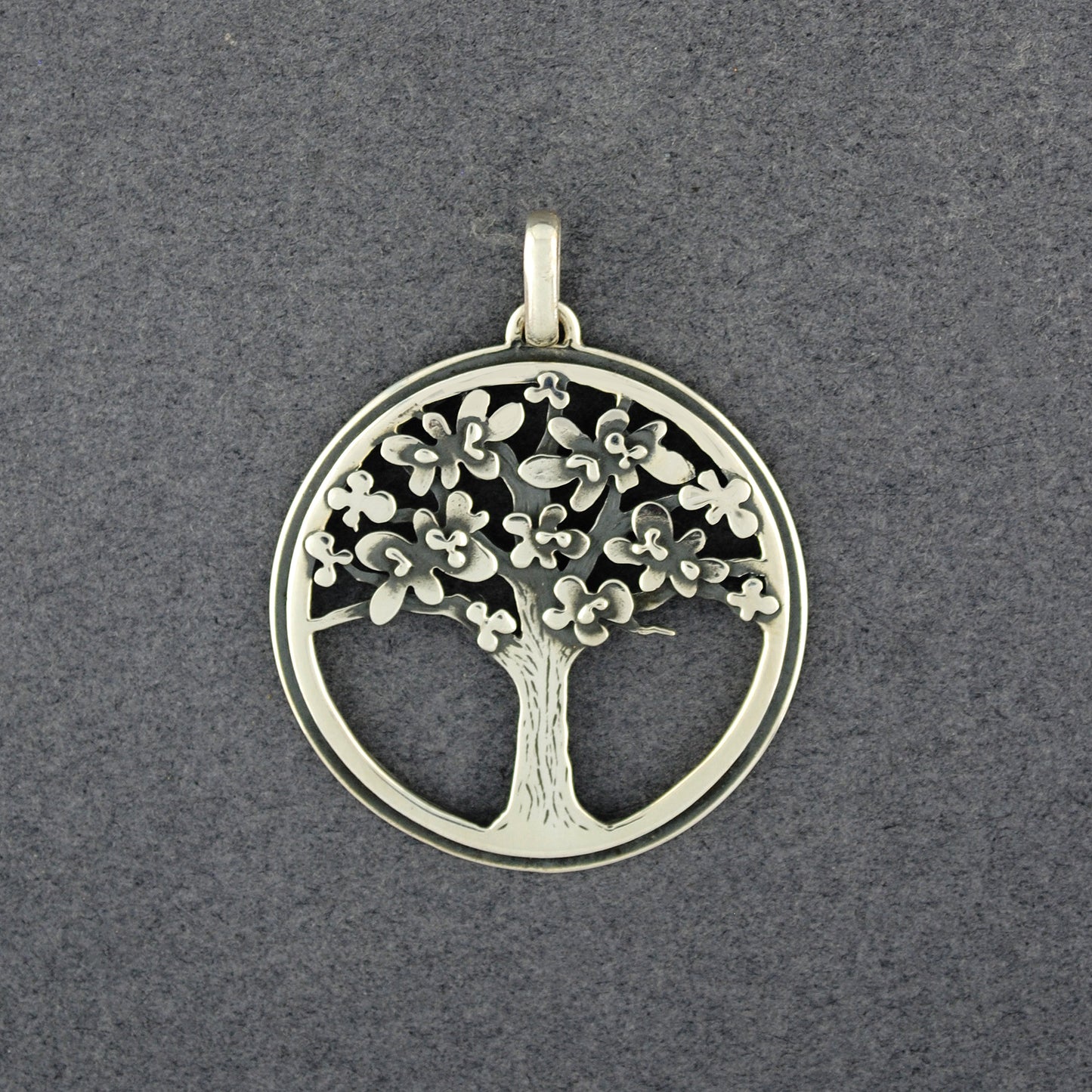 This beautiful hand made pendant features a subtly detailed tree with flowers in bloom.